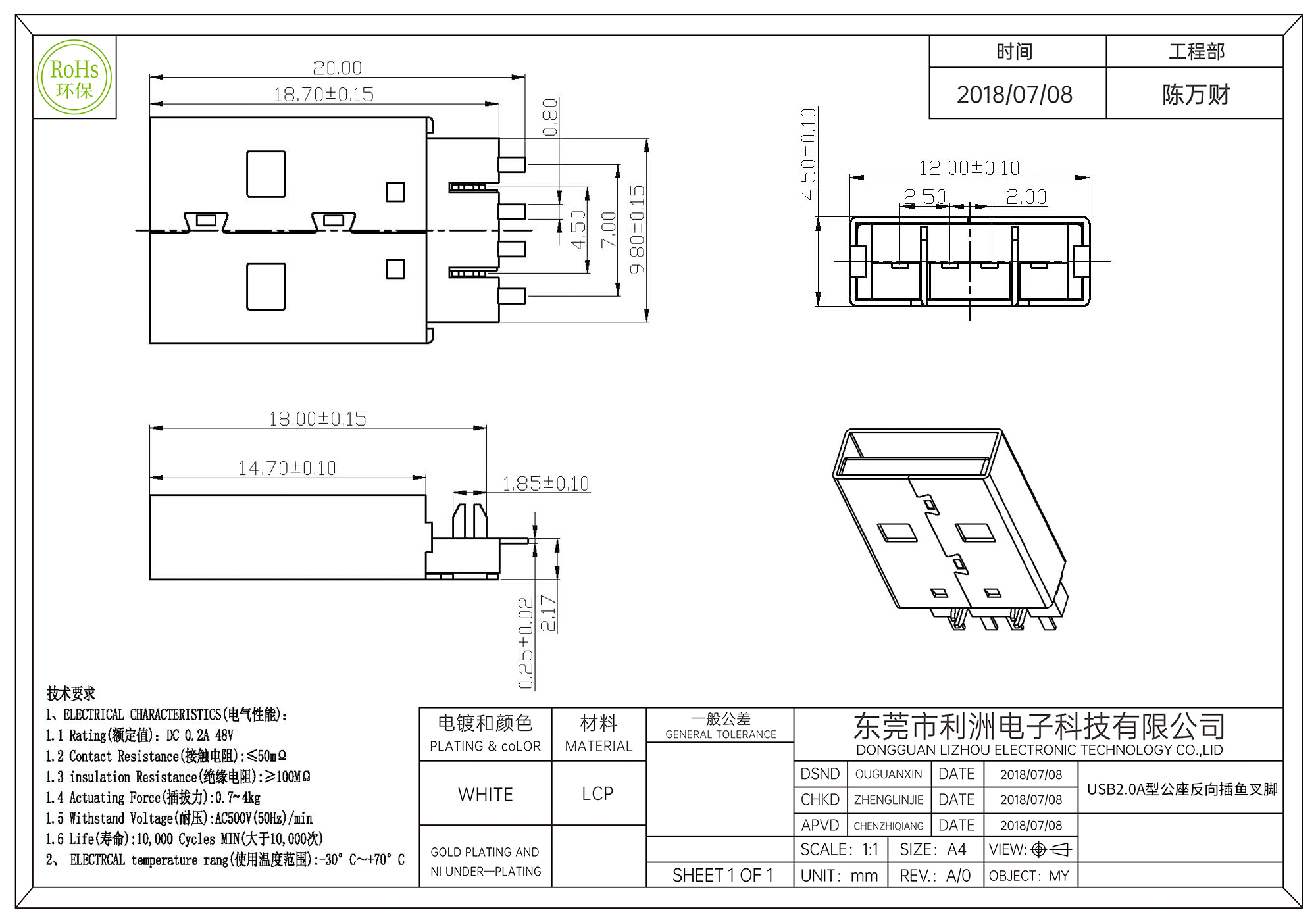 USB2.0A型公座反向插鱼叉脚