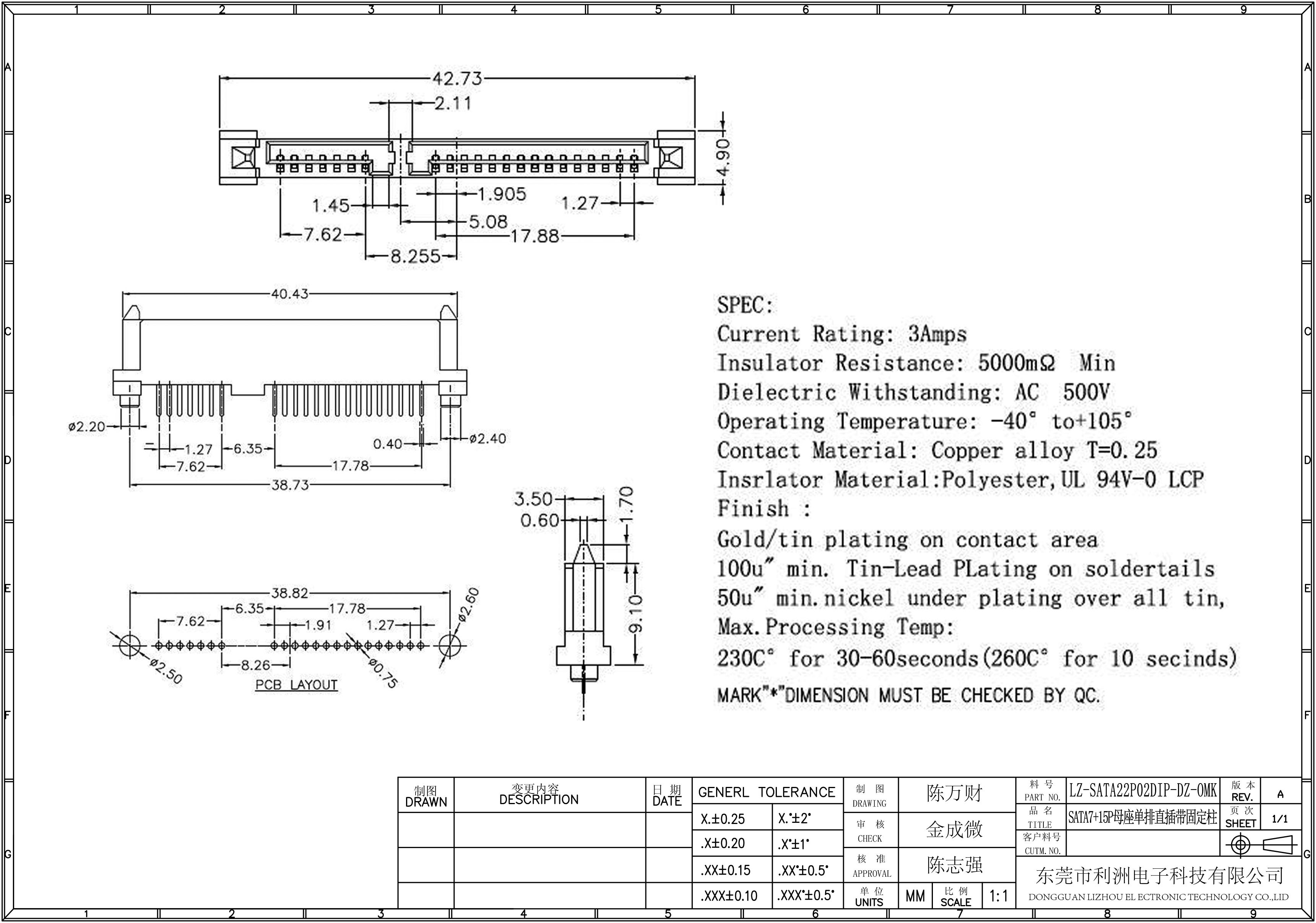 SATA7+15P母座单排直插带固定柱