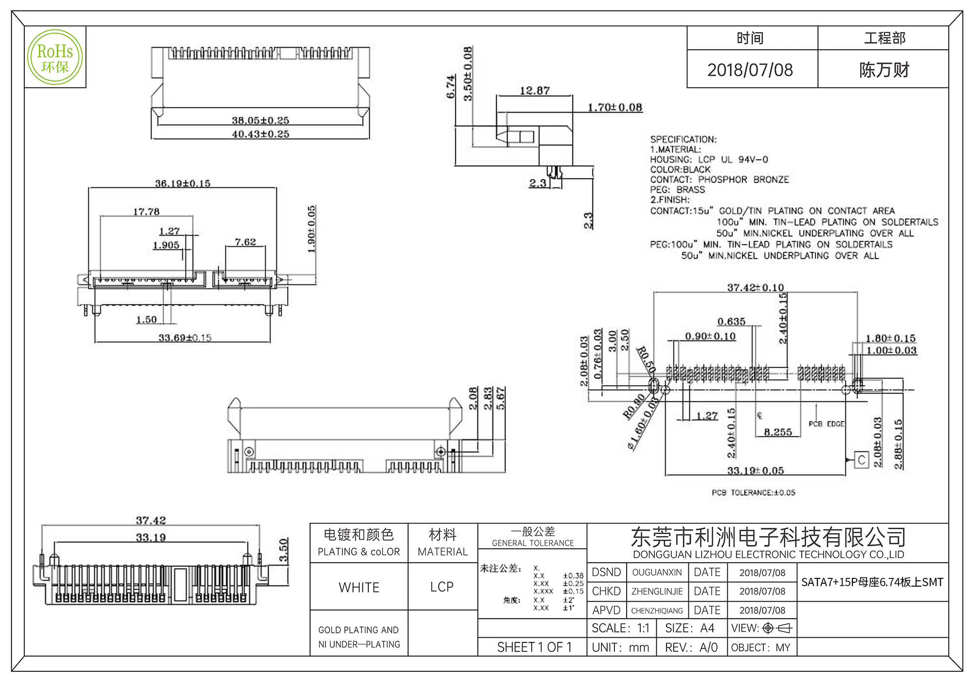 Finish Contact: 15u" gold/tin plating on contact area 100u" min tin-lead plating on soldertails 50u" min nickel underplating on soldertails 50u" min nickel underplating over all